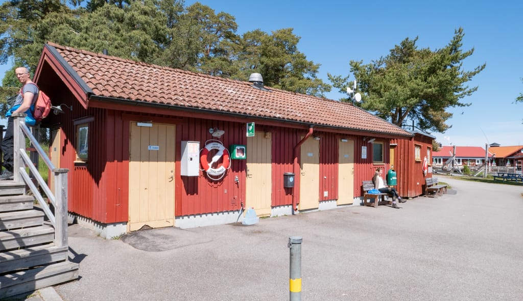 Ställplatsen ligger upp mot skogen, ett par hundra meter från själva hamnen. Det innebär en promenad i morgonrock ner till servicehuset som ligger i hamnen.