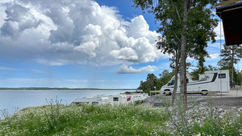 Många pratar om ställplatsen vid Urö Gård utanför Hudiksvall. Jag kunde givetvis inte låta bli att svänga av när jag passerade på E4:an för att ta mig en titt. Ställplatsen ligger precis intill havet med en strålande utsikt över Hudiksvallsfjärden. Ställplatsen är helt nybyggd och i två etage, klok planering då alla får sjöutsikt.