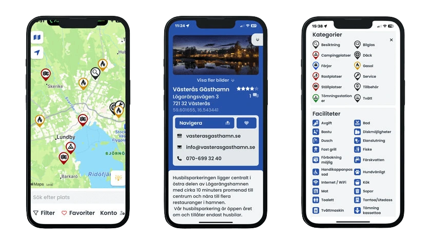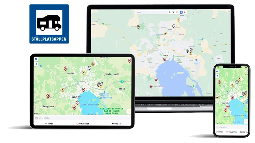 Telefon, platta eller dator - All information lätt att hitta. I vår app hittar du ställplatser, campingar, service, färjelinjer med mera.